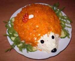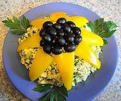 Огурцы режем кружочками (представляем в виде «овощной воронки»), выкладываем равномерно по всей поверхности салата. Красный сладкий перец, в свою очередь, нарезаем кубиками, треугольниками, звездочками, колечками, соломкой. Таким же способом нарезаем и вареную морковь, предварительно сделав в овоще небольшие продольные надрезы равной глубины. В случае, если Вы решите дополнить салат свеклой, тогда выкладывайте овощ на листья салата (капусты), т.к. в этом случае свекольный сок не будет растекаться по всему блюду, сохранив его первоначальные вкусовые качества. Яйца нарезаем мелкими кусочками, дольками, используем яйцерезку. Всем нам нравится просматривать салаты с фото, а не просто рецепты. Если Вы - любитель острого вкуса, то без тертого хрена, горького стручкового перца, измельченного лука Вам не обойтись. Овощи выкладываем горкой, что позволит не нарушить общего внешнего вида блюда. Варьируйте с цветом Ваших овощей. Это позволит сделать Ваш салат более ярким. Сеточка из цветного майонеза (сметаны) - оригинальное решение в части украшения салата. Для данной цели используем шприц для крема (кулек из обычной бумаги), отрезаем кончик. Диаметр отверстия должен составлять не менее 1,5 см. Украшение и оформление салата значит отнюдь не меньше, чем его обычные вкусовые качества. Проявляйте фантазию, импровизируйте.