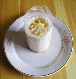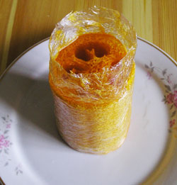 | Сделаем центральную часть нашего будущего мыла. Обернем натуральную мочалку (люфу) прозрачной пищевой плёнкой в несколько слоев, не забывая при этом закрыть плёнкой дно будущей отливки. Закрепим пленку скотчем. Заготовка должна получиться вот такая. | ||