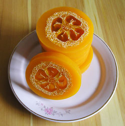 | Для окрашивания мыла берем облепиховое масло: десертная ложка приблизительно на 500 грамм основы. При использовании масла из листьев и плодов облепихи, цвет мыла получается довольно насыщенным. Для ароматизации добавляем масло красного апельсина. | |