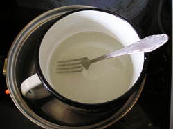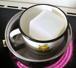 | Теперь надо расплавить и покрасить основу. Отрезаем нужное количество от куска и, не измельчая, кладем в кастрюлю на водяной бане. | |
