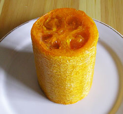 ![]() | Ножом-пилой разделим отливку с люфой на небольшие порции. Двуцветное мыло с люфой полностью готово. |