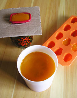 | Внешнюю часть мыла делаем из белой основы. Так же покрасим её облепиховым маслом и ароматизируем эфирным маслом апельсина. Если у вас нет белой основы, можно второй слой окрасить контрастно. Например, добавив измельченную сухую петрушку, косметическую глину или корицу. | |