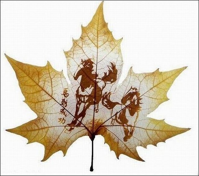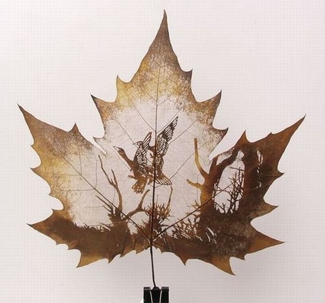 Вы можете подумать, что же можно сделать с ними? Можно собрать их, различных цветов, форм и размеров для детей школьников, можно сделать из них коллаж или фотографию. Но вот то, что может сделать на осенних листьях художник — это поразительно! Искусство резьбы по осенним листьям появилось совсем недавно и некоторые картины могут делаться несколько месяцев.