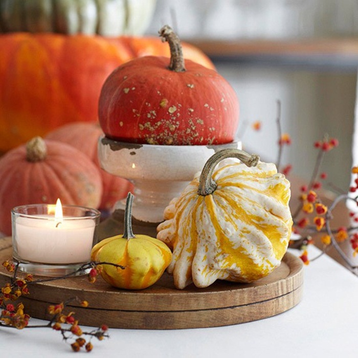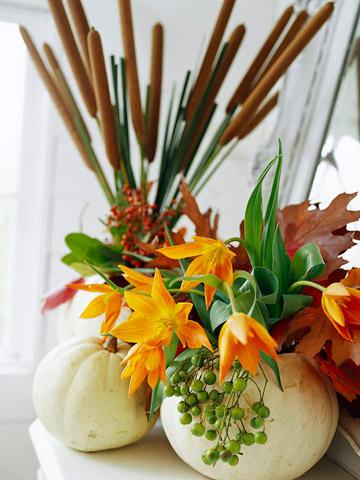 Тыквы бывают всех форм и цветов, и они легко могут стать уникальными осенними вазами. Нужно вырезать отверстие достаточно большое, чтобы разместить в них цветы, ветки, листья.
