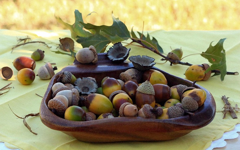 Также можно разложить декоративные тыковки на столе вместе с яблоками, желудями и орехами.