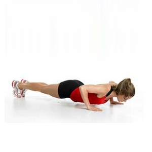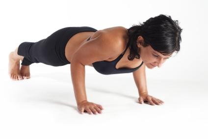 Отжаться вверх до полного выпрямления рук, считая до трех, затем медленно опуститесь в исходное положение, по окончании движения сделать выдох. Выполните три-пять подходов до 10 отжиманий.